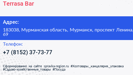 Terrasa Bar по адресу 183038, Мурманская область, Мурманск, проспект Ленина, 69 в дальнейшем Организация, размещена в следующих категориях: