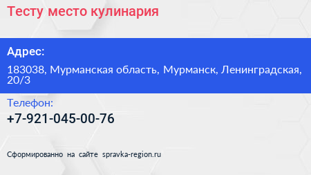 Тесту место, кулинария по адресу 183038, Мурманская область, Мурманск, Ленинградская, 20/3 в дальнейшем Организация, размещена в следующих категориях: