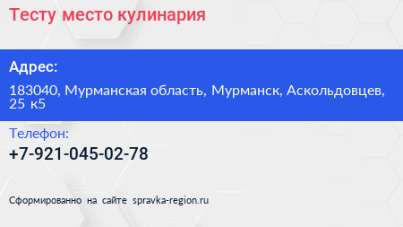 Тесту место, кулинария по адресу 183040, Мурманская область, Мурманск, Аскольдовцев, 25 к5 в дальнейшем Организация, размещена в следующих категориях: