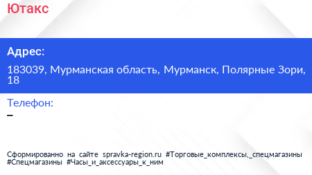 Ютакс по адресу 183039, Мурманская область, Мурманск, Полярные Зори, 18 в дальнейшем Организация, размещена в следующих категориях: