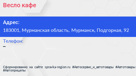 Весло, кафе по адресу 183001, Мурманская область, Мурманск, Подгорная, 92 в дальнейшем Организация, размещена в следующих категориях:
