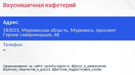 Вкусняшечная, кафетерий по адресу 183031, Мурманская область, Мурманск, проспект Героев-североморцев, 68 в дальнейшем Организация, размещена в следующих категориях: