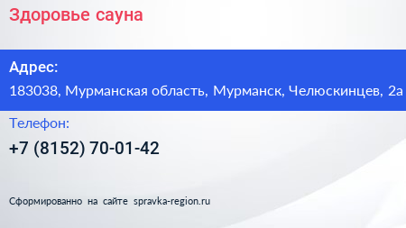 Здоровье, сауна по адресу 183038, Мурманская область, Мурманск, Челюскинцев, 2а в дальнейшем Организация, размещена в следующих категориях: