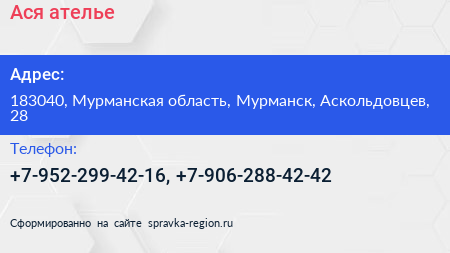 Ася, ателье по адресу 183040, Мурманская область, Мурманск, Аскольдовцев, 28 в дальнейшем Организация, размещена в следующих категориях: