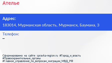 Ателье по адресу 183014, Мурманская область, Мурманск, Баумана, 3 в дальнейшем Организация, размещена в следующих категориях: