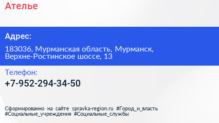 Ателье по адресу 183036, Мурманская область, Мурманск, Верхне-Ростинское шоссе, 13 в дальнейшем Организация, размещена в следующих категориях: