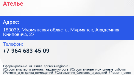 Ателье по адресу 183039, Мурманская область, Мурманск, Академика Книповича, 27 в дальнейшем Организация, размещена в следующих категориях: