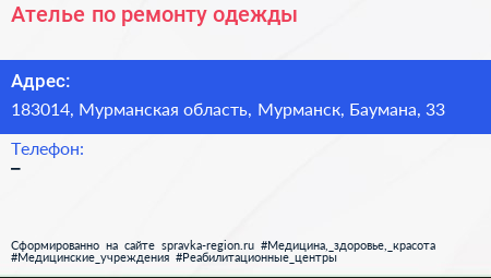 Ателье по ремонту одежды по адресу 183014, Мурманская область, Мурманск, Баумана, 33 в дальнейшем Организация, размещена в следующих категориях: