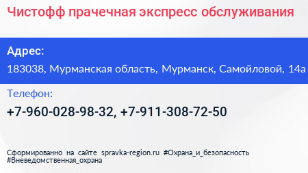 Чистофф, прачечная экспресс-обслуживания по адресу 183038, Мурманская область, Мурманск, Самойловой, 14а в дальнейшем Организация, размещена в следующих категориях: