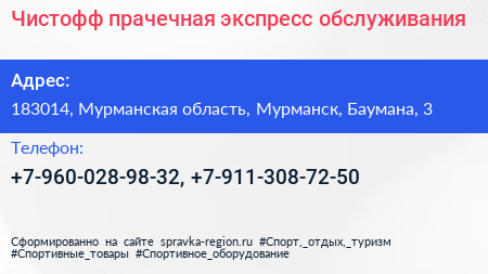 Чистофф, прачечная экспресс-обслуживания по адресу 183014, Мурманская область, Мурманск, Баумана, 3 в дальнейшем Организация, размещена в следующих категориях: