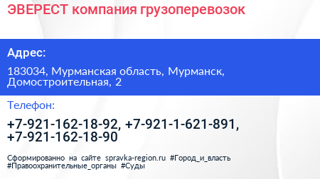 ЭВЕРЕСТ, компания грузоперевозок по адресу 183034, Мурманская область, Мурманск, Домостроительная, 2 в дальнейшем Организация, размещена в следующих категориях: