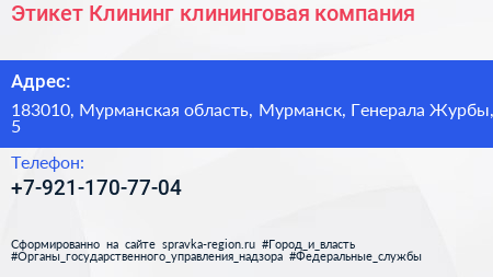 Этикет Клининг, клининговая компания по адресу 183010, Мурманская область, Мурманск, Генерала Журбы, 5 в дальнейшем Организация, размещена в следующих категориях: