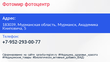 Фотомир, фотоцентр по адресу 183039, Мурманская область, Мурманск, Академика Книповича, 5 в дальнейшем Организация, размещена в следующих категориях: