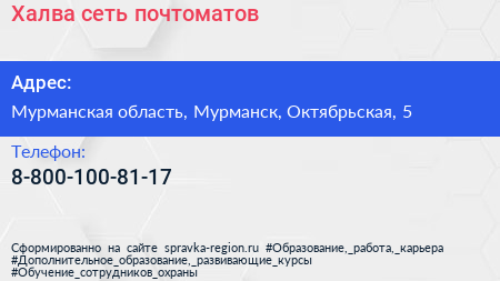 Халва, сеть почтоматов по адресу Мурманская область, Мурманск, Октябрьская, 5 в дальнейшем Организация, размещена в следующих категориях: