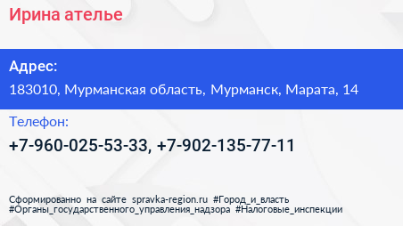Ирина, ателье по адресу 183010, Мурманская область, Мурманск, Марата, 14 в дальнейшем Организация, размещена в следующих категориях: