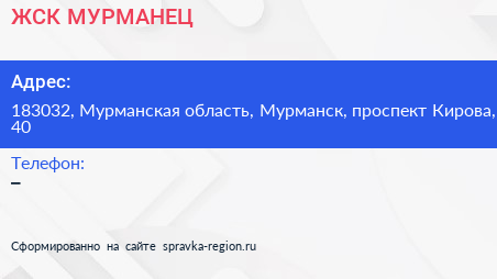 ЖСК МУРМАНЕЦ по адресу 183032, Мурманская область, Мурманск, проспект Кирова, 40 в дальнейшем Организация, размещена в следующих категориях: