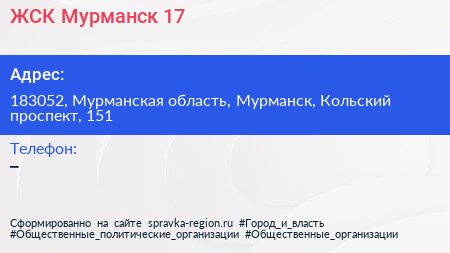 ЖСК Мурманск-17 по адресу 183052, Мурманская область, Мурманск, Кольский проспект, 151 в дальнейшем Организация, размещена в следующих категориях: