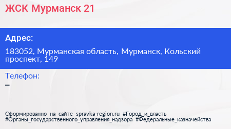 ЖСК Мурманск-21 по адресу 183052, Мурманская область, Мурманск, Кольский проспект, 149 в дальнейшем Организация, размещена в следующих категориях: