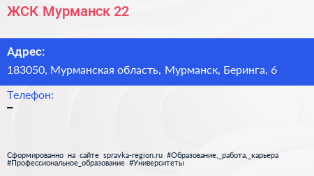 ЖСК Мурманск-22 по адресу 183050, Мурманская область, Мурманск, Беринга, 6 в дальнейшем Организация, размещена в следующих категориях: