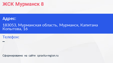 ЖСК Мурманск-8 по адресу 183053, Мурманская область, Мурманск, Капитана Копытова, 16 в дальнейшем Организация, размещена в следующих категориях: