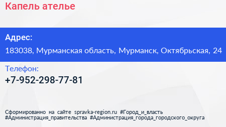 Капель, ателье по адресу 183038, Мурманская область, Мурманск, Октябрьская, 24 в дальнейшем Организация, размещена в следующих категориях: