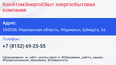 КолАтомЭнергоСбыт, энергосбытовая компания по адресу 183038, Мурманская область, Мурманск, Шмидта, 16 в дальнейшем Организация, размещена в следующих категориях: