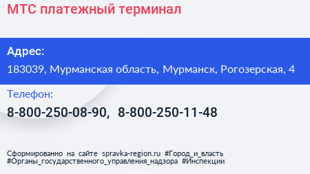 МТС, платежный терминал по адресу 183039, Мурманская область, Мурманск, Рогозерская, 4 в дальнейшем Организация, размещена в следующих категориях: