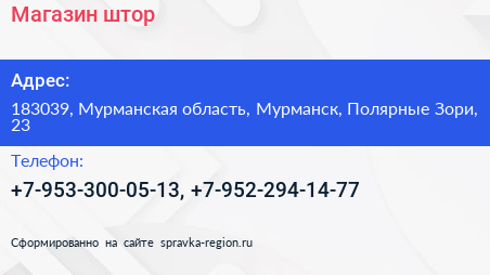 Магазин штор по адресу 183039, Мурманская область, Мурманск, Полярные Зори, 23 в дальнейшем Организация, размещена в следующих категориях: