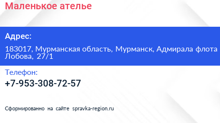 Маленькое ателье по адресу 183017, Мурманская область, Мурманск, Адмирала флота Лобова, 27/1 в дальнейшем Организация, размещена в следующих категориях: