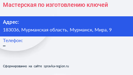 Мастерская по изготовлению ключей по адресу 183036, Мурманская область, Мурманск, Мира, 9 в дальнейшем Организация, размещена в следующих категориях: