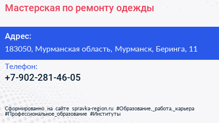 Мастерская по ремонту одежды по адресу 183050, Мурманская область, Мурманск, Беринга, 11 в дальнейшем Организация, размещена в следующих категориях: