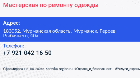 Мастерская по ремонту одежды по адресу 183052, Мурманская область, Мурманск, Героев Рыбачьего, 40а в дальнейшем Организация, размещена в следующих категориях: