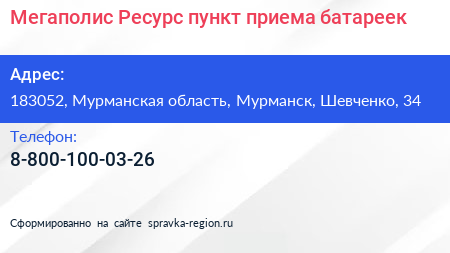 Мегаполис Ресурс, пункт приема батареек по адресу 183052, Мурманская область, Мурманск, Шевченко, 34 в дальнейшем Организация, размещена в следующих категориях: