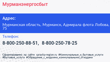Мурманэнергосбыт по адресу Мурманская область, Мурманск, Адмирала флота Лобова, 75 в дальнейшем Организация, размещена в следующих категориях: