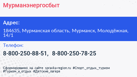 Мурманэнергосбыт по адресу 184635, Мурманская область, Мурманск, Молодёжная, 14/1 в дальнейшем Организация, размещена в следующих категориях: