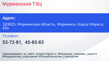 Мурманская ТЭЦ по адресу 183025, Мурманская область, Мурманск, Карла Маркса, 42а в дальнейшем Организация, размещена в следующих категориях: