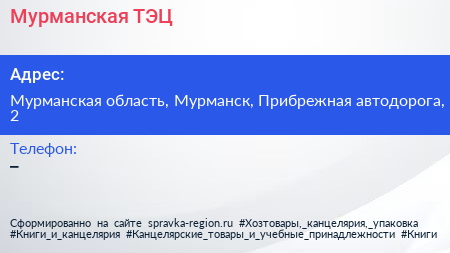 Мурманская ТЭЦ по адресу Мурманская область, Мурманск, Прибрежная автодорога, 2 в дальнейшем Организация, размещена в следующих категориях: