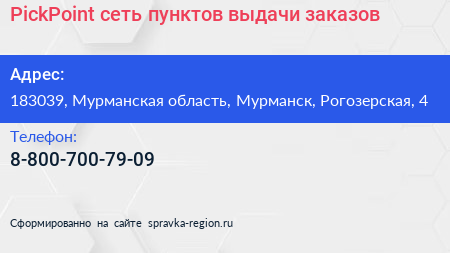 PickPoint, сеть пунктов выдачи заказов по адресу 183039, Мурманская область, Мурманск, Рогозерская, 4 в дальнейшем Организация, размещена в следующих категориях: