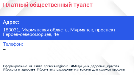 Платный общественный туалет по адресу 183031, Мурманская область, Мурманск, проспект Героев-североморцев, 4е в дальнейшем Организация, размещена в следующих категориях: