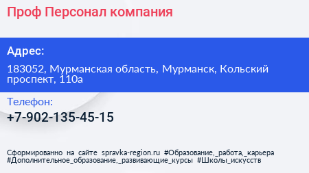 Проф-Персонал, компания по адресу 183052, Мурманская область, Мурманск, Кольский проспект, 110а в дальнейшем Организация, размещена в следующих категориях: