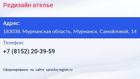 Редизайн, ателье по адресу 183038, Мурманская область, Мурманск, Самойловой, 14 в дальнейшем Организация, размещена в следующих категориях: