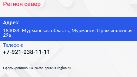 Регион-север по адресу 183034, Мурманская область, Мурманск, Промышленная, 29а в дальнейшем Организация, размещена в следующих категориях: