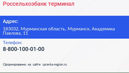 Россельхозбанк, терминал по адресу 183032, Мурманская область, Мурманск, Академика Павлова, 11 в дальнейшем Организация, размещена в следующих категориях: