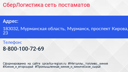 СберЛогистика, сеть постаматов по адресу 183032, Мурманская область, Мурманск, проспект Кирова, 23 в дальнейшем Организация, размещена в следующих категориях: