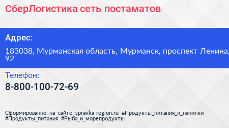 СберЛогистика, сеть постаматов по адресу 183038, Мурманская область, Мурманск, проспект Ленина, 92 в дальнейшем Организация, размещена в следующих категориях: