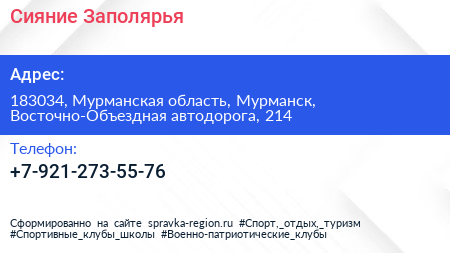 Сияние Заполярья по адресу 183034, Мурманская область, Мурманск, Восточно-Объездная автодорога, 214 в дальнейшем Организация, размещена в следующих категориях: