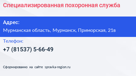 Специализированная похоронная служба по адресу Мурманская область, Мурманск, Приморская, 21в в дальнейшем Организация, размещена в следующих категориях: