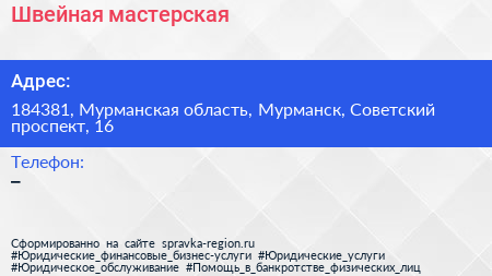 Швейная мастерская по адресу 184381, Мурманская область, Мурманск, Советский проспект, 16 в дальнейшем Организация, размещена в следующих категориях:
