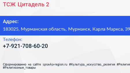 ТСЖ Цитадель-2 по адресу 183025, Мурманская область, Мурманск, Карла Маркса, 39 в дальнейшем Организация, размещена в следующих категориях: