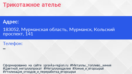 Трикотажное ателье по адресу 183052, Мурманская область, Мурманск, Кольский проспект, 141 в дальнейшем Организация, размещена в следующих категориях: